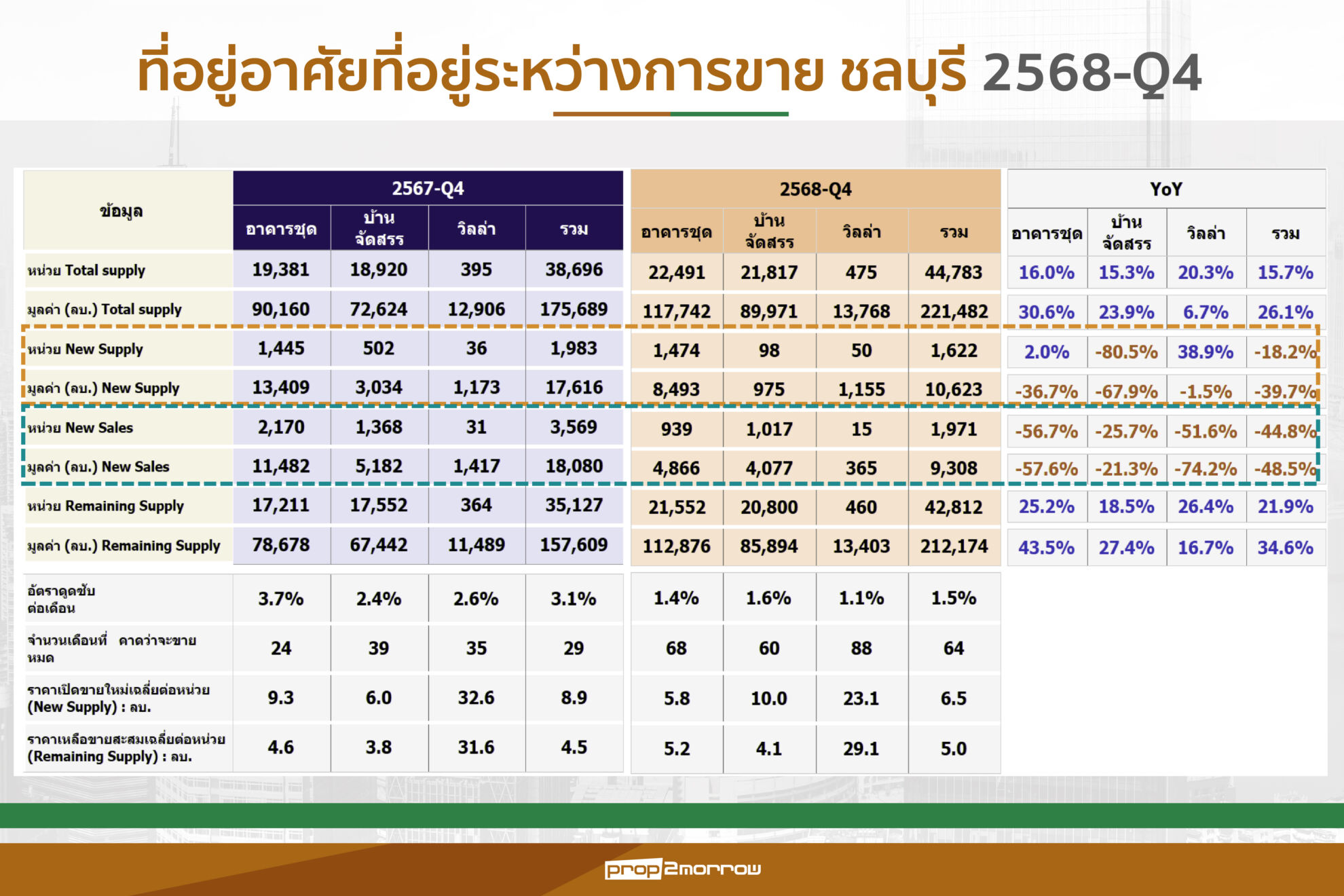 ขณะที่ Total Supply มีหน่วยเสนอขายรวม 44,783 ยูนิต เพิ่มขึ้น 15.7% เมื่อเทียบกับปีก่อน โดยมีมูลค่ารวมสูงถึง 221,482 ล้านบาท แบ่งเป็นอาคารชุด 22,491 ยูนิต มูลค่ารวม 117,742 ล้านบาท บ้านจัดสรร 21,817 ยูนิต มูลค่ารวม 89,971 ล้านบาท และวิลล่า 475 ยูนิต มูลค่ารวม 13,768 ล้านบาท