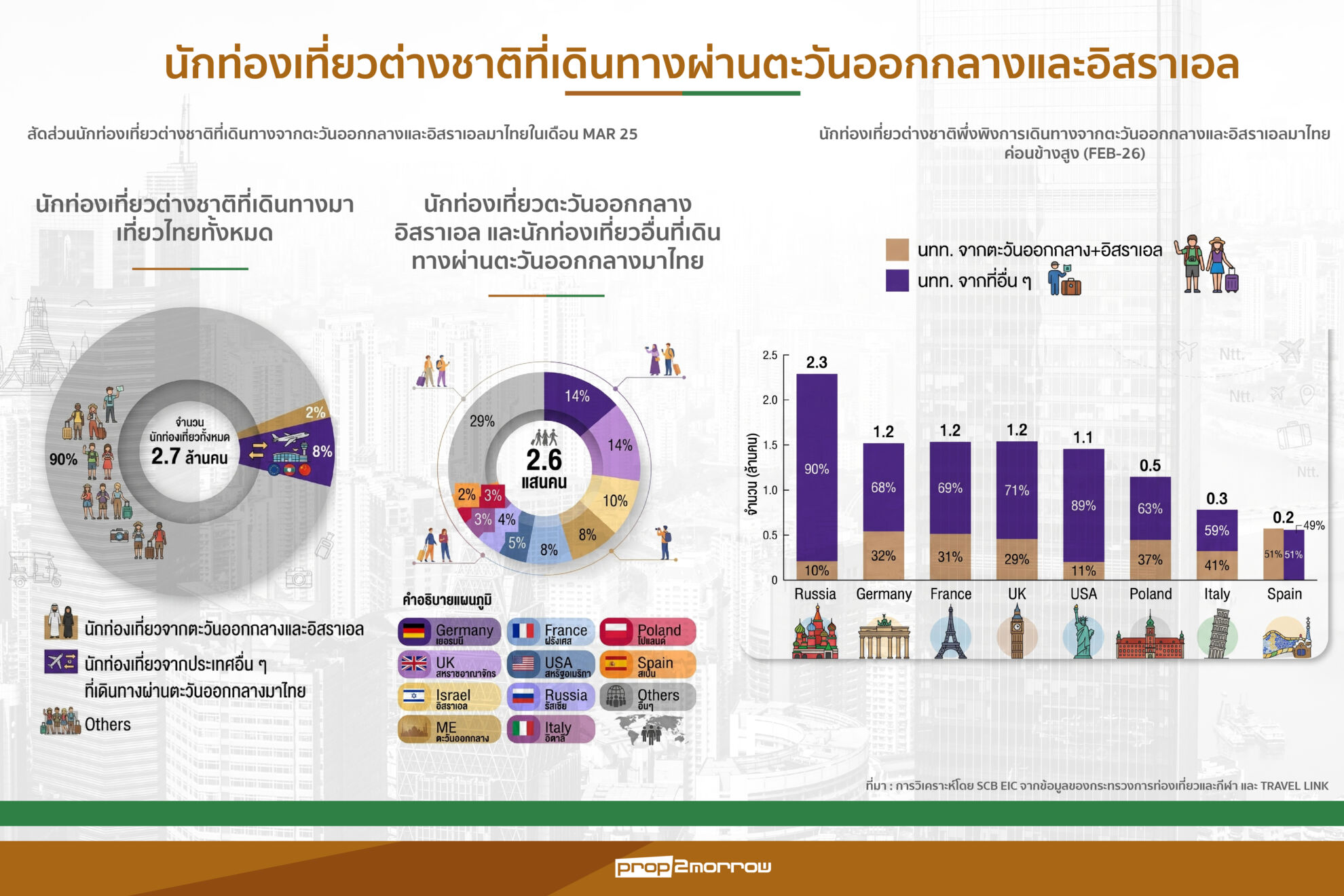 การวิเคราะห์โดย SCB EIC ระบุว่าวิกฤตตะวันออกกลางที่คาดว่าจะยืดเยื้อไปอย่างน้อย 8 สัปดาห์อาจกดดันให้นักท่องเที่ยวต่างชาติที่เดินทางมาไทยชะลอตัวลงมาอยู่ที่ประมาณ 33.2 ล้านคนจากประมาณการเดิมในเดือนธันวาคมที่ 34.1 ล้านคน