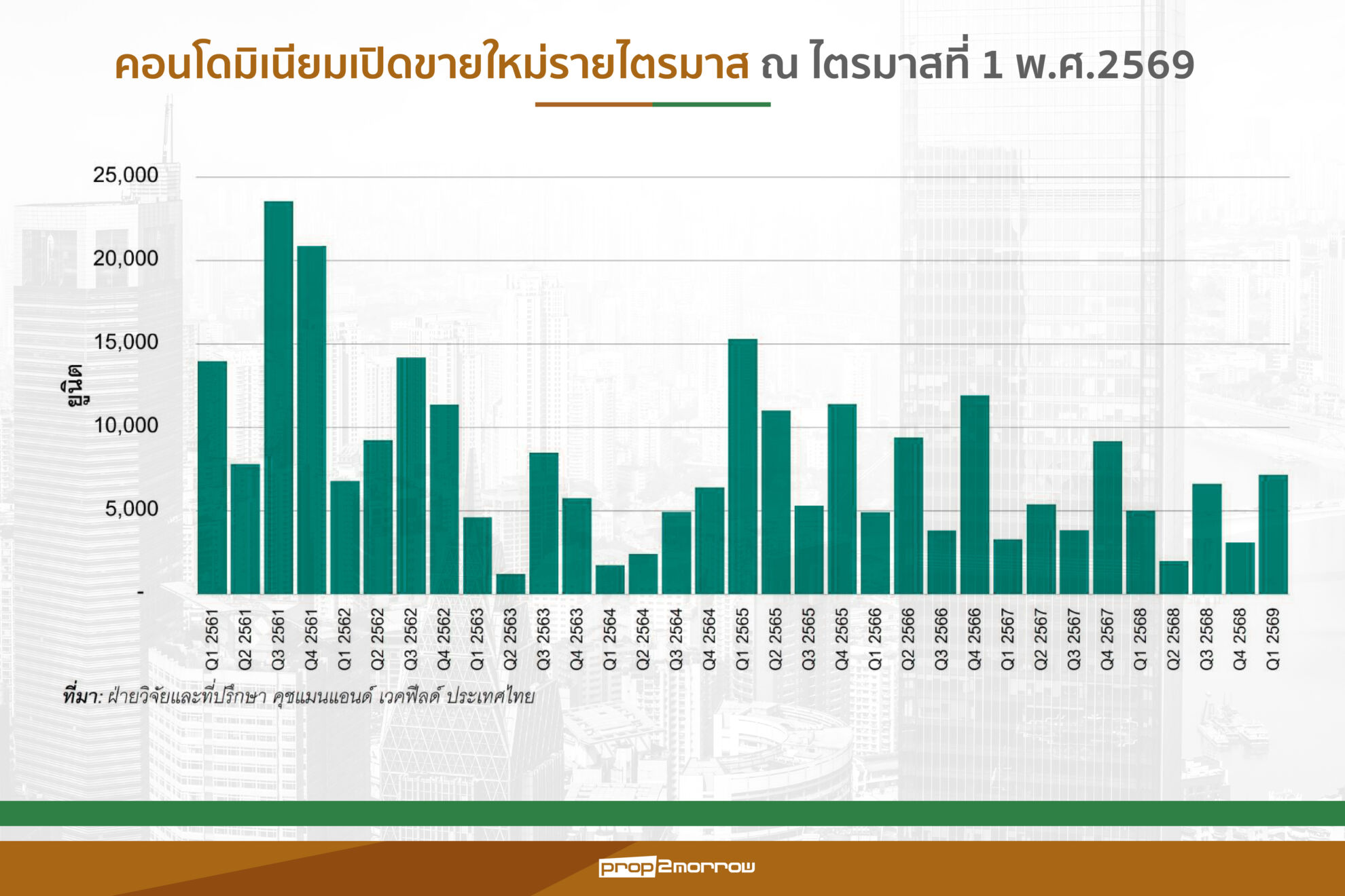 คุชแมน แอนด์ เวคฟิลด์ ประเมินอุปทานใหม่ปี 2569 เปิดขายใหม่ประมาณ 17,000 ยูนิตลดลงเกือบ 50% เมื่อเทียบกับปี 2568 ขณะที่ไตรมาสแรกเปิดตัวแรงกว่า 7,000 ยูนิต ชี้อัตราการขายมีแนวโน้มอยู่ในระดับต่ำ สอดคล้องกับภาวะเศรษฐกิจที่ชะลอตัว
