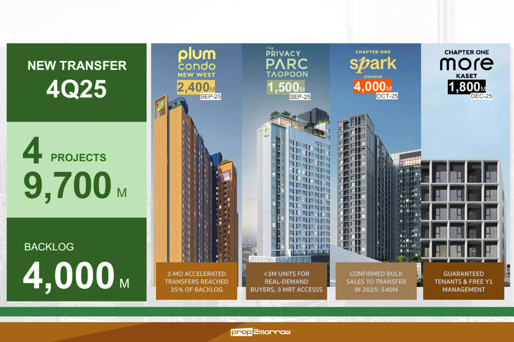 พร้อมกันนี้บริษัทยังได้ทยอยส่งมอบ 4 โครงการคอนโดฯสร้างเสร็จใหม่ มูลค่ารวมกว่า 9,700 ล้านบาท ซึ่งได้เริ่มรับรู้รายได้มาตั้งแต่ไตรมาส 3 และต่อเนื่องไตรมาส 4 ไปจนถึงต้นปี 2569 ได้แก่ พลัมคอนโด นิวเวสต์, เดอะ ไพรเวซี่ พาร์ค เตาปูน, แชปเตอร์วัน สปาร์ค จรัญ และคอนโดแชปเตอร์วัน มอร์ เกษตร ซึ่งการันตีผู้เช่าและค่าจัดหาผู้เช่าให้ฟรีในปีแรก