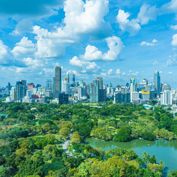 Beautiful landscape of cityscape with city building around lumpini park in bangkok Thailand