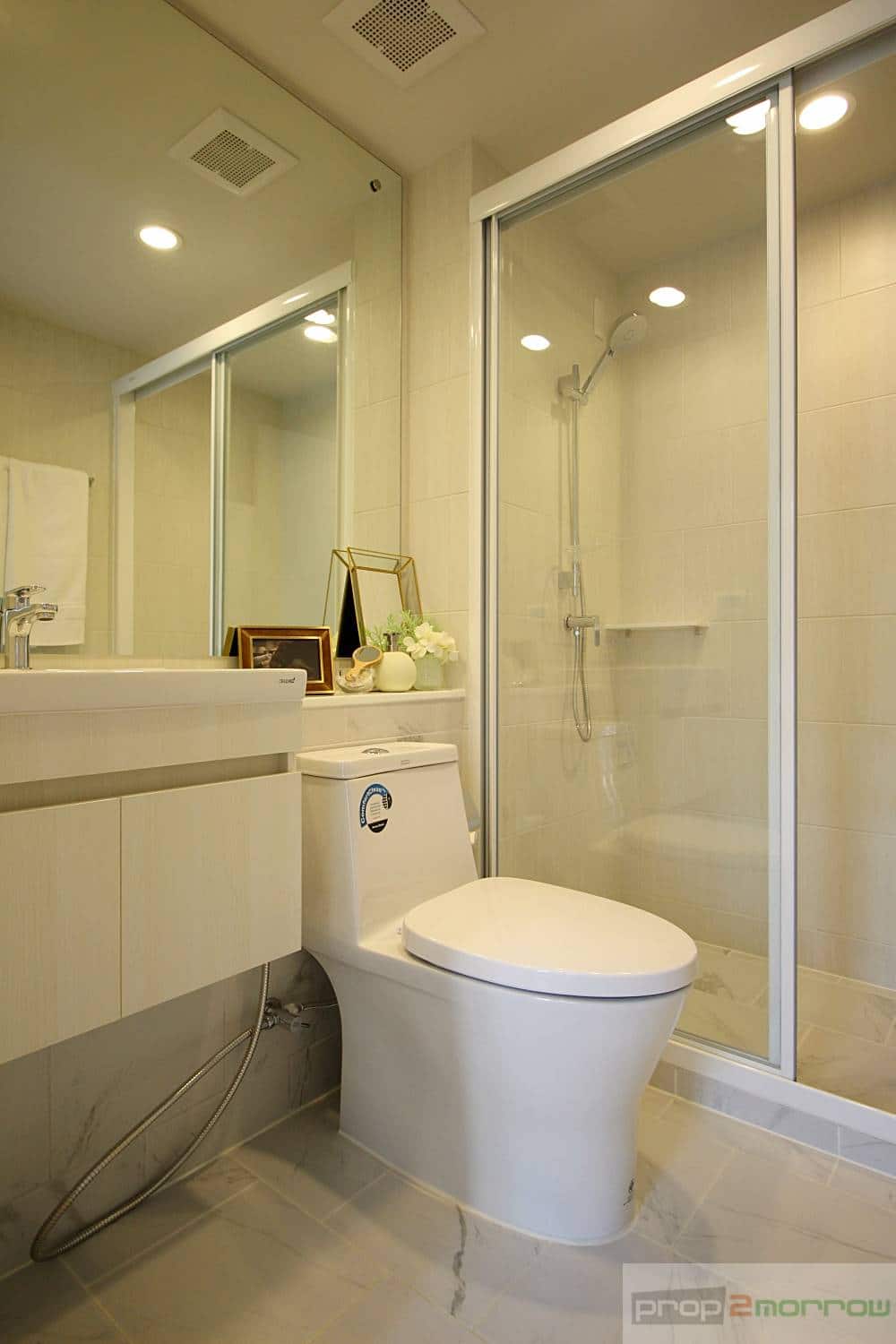 ส่วนของห้องน้ำ พื้นห้องน้ำเป็นกระเบื้องเซรามิกลายหินอ่อน พื้นที่แยกส่วนแห้งและส่วนเปียกใช้งานได้สะดวก เดี๋ยวจะพาไล่ดูทีละส่วนนะครับ