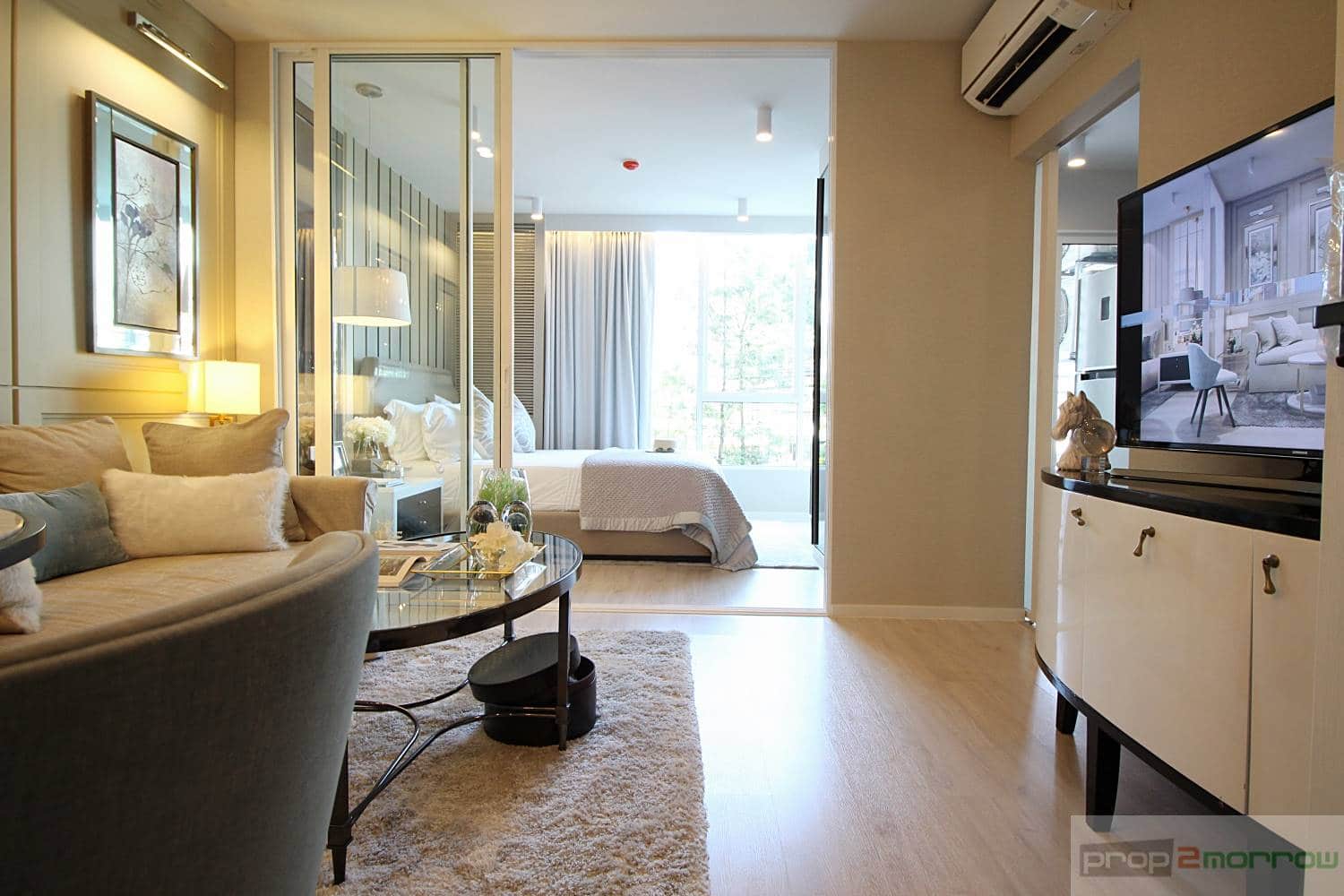 ส่วนของห้องนอนและ Living Area คั่นด้วยผ้าม่าน โดยรูปแบบห้องจะเป็นเหมือนห้อง Studio แต่เพิ่มความเป็นส่วนตัวของห้องนอนได้จากผ้าม่าน หรืออาจจะกั้นฉากด้วยประตูได้