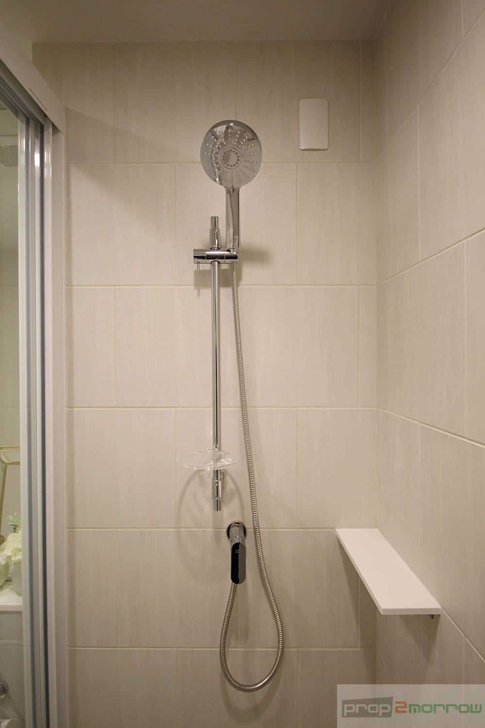 ส่วนอาบน้ำติดตั้งชุดฝักบัว ฝักบัวขนาดใหญ่ปรับระดับน้ำได้ ส่วนของผนังด้านข้างติดที่วางของวัสดุหินสังเคราะห์สำหรับวางสบู่อาบน้ำ แชมพูสระผม
